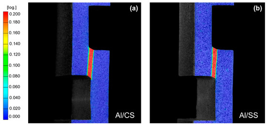 Von Mises equivalent strain distribution map: (a) Al/CS weld—ductile fracture; (b) Al/SS weld—ductile fracture.