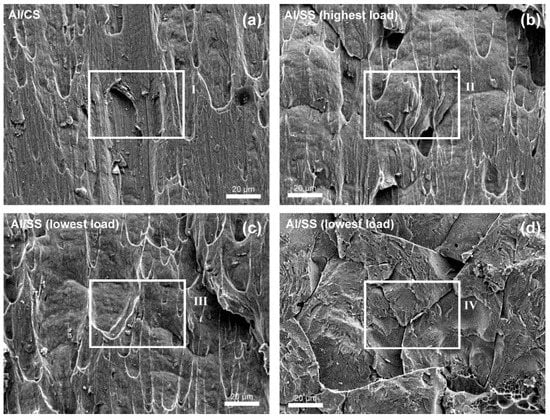 SEM micrographs of the fracture surface of the welds: (a) Al/CS welds; (b) Al/SS welds—highest maximum load; (c,d) Al/SS welds—lowest maximum load.