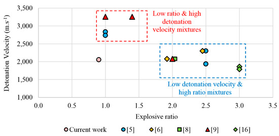 One of the topics of the present work is the study of a novel explosive mixture that has a low detonation velocity, low density and that does not need a high thickness to detonate, i.e. it can be used with a low explosive ratio. Figure 9 shows a sample of results from different works relating the detonation velocity with the explosive ratio used. The figure illustrates the abovementioned fact that, except for the mixture used in the present research, the explosive mixtures of lower detonation velocities tend to be used with higher explosive ratios. Since low-detonation velocity explosives usually need higher thickness, most explosive mixtures depart from the graph’s origin. This proves the importance of developing mixtures that provide low detonation velocities and can detonate with thin layers. As referred above, the mixture developed in LEDAP and used in the present research has low detonation velocity, low density and does not need a high thickness to detonate. This is an important issue, especially for the welding of low-thickness and low-density flyers.