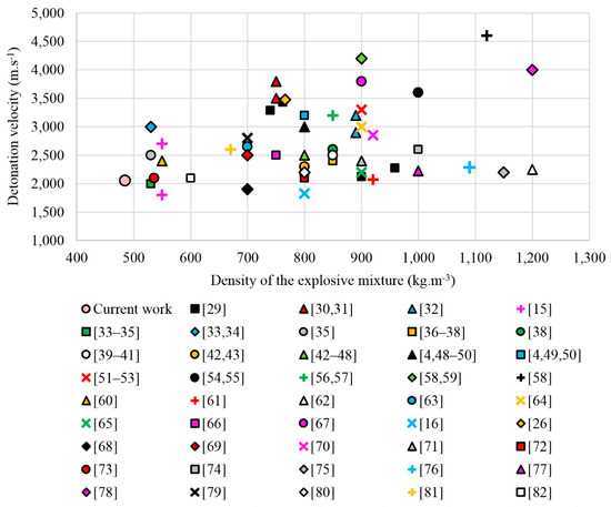 Graph relating the detonation velocity and the density of tested explosive mixtures. Data from [4,15,16,26,29,30,31,32,33,34,35,36,37,38,39,40,41,42,43,44,45,46,47,48,49,50,51,52,53,54,55,56,57,58,59,60,61,62,63,64,65,66,67,68,69,70,71,72,73,74,75,76,77,78,79,80,81,82].
