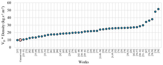 In order to examine the detonation velocity and the density together, they were multiplied by one another. In this way, the two parameters were ordered on a single axis and are shown in Figure 11. The mixture tested in the present work presents one of the lowest values of Vd.ρexp among all the 58 works analyzed. Figure 9, Figure 10 and Figure 11 show that the mixture is outside the groups of mixtures most tested in explosive welding literature. One of the limitations of the explosive welding process is precisely the difficulty of welding very thin plates (mainly the flyer plate). It happens due to the complexity of detonating thin layers of energetic mixtures that can provide the parameters needed, and because of the damage that the detonation causes on thin plates. This new mixture of energetic material enables the possibility of a mixture with low-density capable of providing low-detonation velocity, low explosive ratio and low-impact velocity. This is particularly important because it facilitates the welding of thinner materials. Beyond this fact, the tested mixture also has the advantage of reducing the energy conditions at the weld interface, which is significant for material combinations that tend to form intermetallic phases. On the one hand, if these combinations do not form favorable interface morphologies, such as curled waves, the large intermetallic volumes are very detrimental to the mechanical properties of the welds. On the other hand, even when favorable interfaces are formed, it is already established that large volumes of intermetallic phases may affect the physical phenomena at the weld interface, specifically, the solidification time of the interfacial molten material, conditioning the bonding conditions [7].