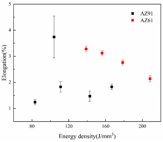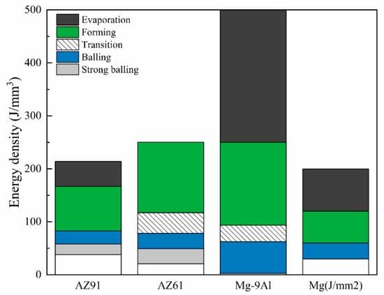 According to the current research results, for AZ61 and AZ91, the relative density of the alloy was close to the theoretical density when the energy density was approximately 100–200 J/mm3. However, the relative density of the ZK series and Mg-9Al alloy was only approximately 75–93% at this energy density. Consequently, the optimal energy density must be determined for the different alloy components in the SLM process.