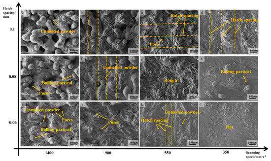 Forming characteristics of SLM magnesium alloy. When the scanning speed is 1400 mm/s, 900 mm/s, 550 mm/s and 250 mm/s respectively, the hatch spacing is 0.06 mm (a–d); hatch spacing of 0.08 mm, (e–h); and hatch spacing of 0.1 mm, (i–l). Reproduction from [28], with permission from Elsevier (Amsterdam, The Netherlands), 2020.