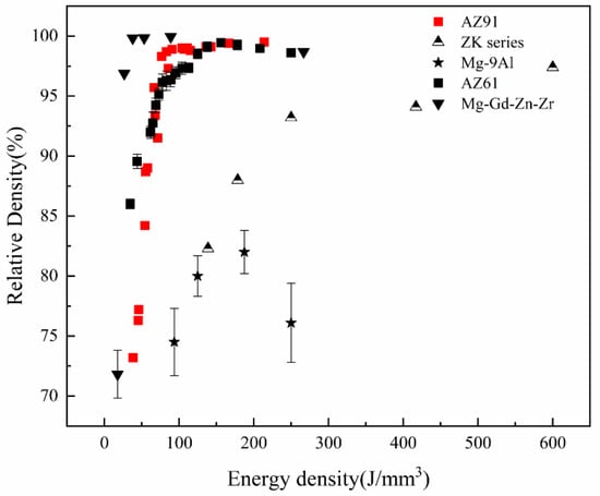 Figure 3 shows that the energy density under the SLM process has an important effect on the relative density of the magnesium alloy [26,27,28,30,32,44]. From the perspective of the AZ61, AZ91, ZK series, Mg-9Al alloys and Mg-Gd-Zn-Zr with increasing energy density, the relative density of the alloy increased.