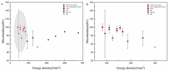 From the perspective of the SLM preparation process, the energy density also has an important effect on the microhardness of different magnesium alloys, as shown in Figure 4 [26,30,32,33,37,41].