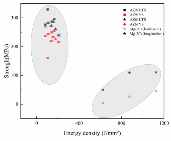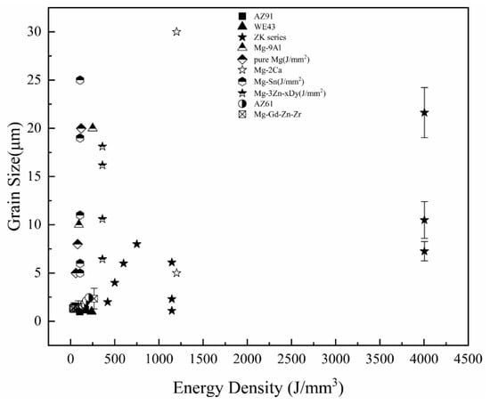 As shown in Table 1 and Table 2, the research materials involve magnesium and its alloy powders, and different research institutions have studied the mechanical properties and corrosion resistance of SLMed magnesium alloys under best processing parameters. There are differences in the optimal energy input for forming magnesium alloys of the same alloy grade. First, the optimal energy input is related to the properties of the powder. Samples containing different particle sizes and particle size distributions require different amounts of energy to fully melt the powder. Second, there are differences in the research equipment used by different research institutions, which creates differences in process conditions. The introduction of different alloying elements into magnesium powder improves its mechanical properties and corrosion resistance. To further analyze the relationship between forming and magnesium alloy properties in the SLM process, the relationship between the energy density and the magnesium alloy grade in Table 1 is determined, as shown in Figure 1.