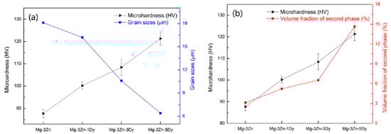 Relationship between grain size, second phase and microhardness of the magnesium alloy: (a) grain size and (b) second phase volume fraction. Reproduction from [40], with permission from Taylor & Francis (London, UK), 2020.
