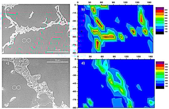 Hardness distribution of the matrix and second phase in AZ91 magnesium alloy. (a) Scanning electron microscopy (SEM) image of the as-cast samples and (b) corresponding nanoindentation hardness mapping. (c) SEM image of the SLSM samples and (d) corresponding hardness mapping. Reproduction from [62], with permission from Elsevier, 2020.