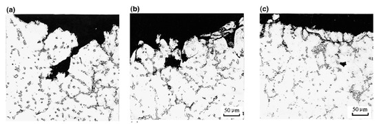 Optical microscopy fractographs showing that the microcracks were prone to initiate near the Mg/Mg17Al12 interface and the grain boundaries: (a) the rear part; (b) the middle part; (c) the impact part. Reproduction from [75], with permission from Elsevier, 2020.