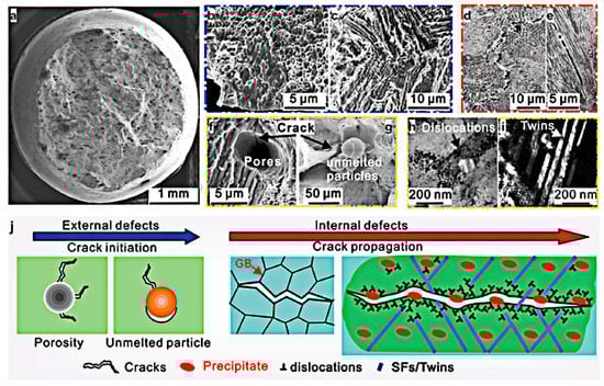 Schematic diagram of SLMed Ag-Cu-Ge alloy premature failure: (a) low-magnification SEM image of fracture surface; (b,c) dimples and cleavage features; (d,e) samples after polishing; (f,g) external defects (pores and unmelted particles); (h,i) internal defects of TEM micrographs; (j) Schematic illustration depicting crack initiation at external defects and crack propagation along internal defects. Reproduction from [93], with permission from Nature Publishing Group (London, UK), 2020.