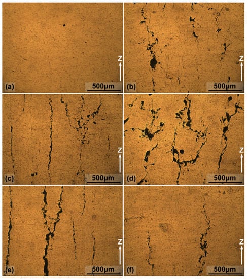 Cracks in SLMed (a) Mg-1Zn, (b) Mg-2Zn, (c) Mg-4Zn, (d) Mg-6Zn, (e) Mg-8Zn, and (f) Mg-10Zn. Reproduction from [43], with permission from Elsevier, 2020.