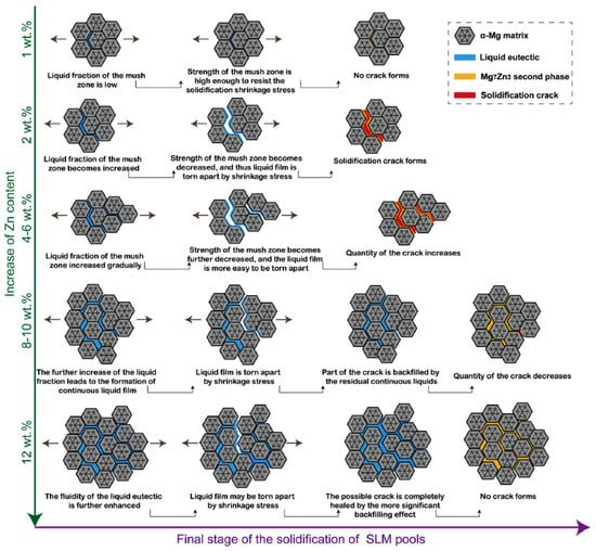 When the Zn content was different, the cracks in the Mg-Zn binary system were also different. The schematic diagram is shown in Figure 13. At a 1 wt.% Zn content, because the Mg7Zn3 eutectic phase was less abundant and mostly granular, the liquid eutectic phase during the final stage of the solidification process was discontinuous and low in content. Therefore, the strength of the mushy zone can resist the solidification shrinkage stress, thereby inhibiting the formation of cracks. As the Zn content increased, the area fraction of the Mg7Zn3 eutectic phase increased, which means that in the final stage of SLM pool solidification, the strength of the mushy zone decreased, leading to the formation of solidification cracks. However, at the same time, the fluidity of the residual liquid was significantly enhanced in the final stage of solidification. As a consequence, when the content of Zn was sufficiently high (12 wt.%), the solidification cracks may be backfilled by the residual liquid during the final stage of solidification, thereby alleviating the cracking tendency. The melting point and thermal expansion coefficient of aluminum are similar to those of magnesium. A similar situation usually occurs in SLMed aluminum alloys. The application of 7075 aluminum alloy is limited by cracking [95,96]. Yuki et al. [95] noted that for 7075 alloy, the optimal silicon content was 5%, which is conducive to eliminating cracks and improving mechanical properties. If the Si content was insufficient, the cracks cannot be completely eliminated. In contrast, excessive Si content resulted in brittleness. Microcracks are commonly attributed to solidification cracking and liquation cracking. The cause of solidification cracking is a residual thin film of liquid phase between the primary crystallized grains, and liquation cracking is caused by cyclic heat input, which occurs in multilayer welding and layered fabrication. The reason for the decrease in strength due to the heat input is mainly due to the eutectic phase or partial remelting of the component with a lower melting point. These melting points serve as the starting points for cracking. Generally, the morphology of the top of the sample can be used to distinguish the two kinds of cracks. The surface layer is not affected by thermal conduction from subsequent layers during fabrication; therefore, the solidification structure that is created by single laser irradiation has been preserved. If cracks appeared on the surface, the influence of the cyclic heat input was excluded, indicating that the cracks were solidification cracks. If microcracks appeared in the lower layer, it indicates that the sample were affected by the cyclic heat input, producing fused cracks. Kimura et al. [97] investigated the relationships between the Si content and the mechanical properties of Al-Si binary alloy samples fabricated by SLM. They noted that the additions of silicon enhanced the proof stress and UTS of SLMed samples because the silicon elements enriched the proportion of the secondary phases, providing compositional reinforcement for the aluminum matrix. The Si helped eliminate microcracks in the Al alloys. The addition of Si induced the formation of eutectics with a low melting point and high fluidity, which decreased the crack sensitivity as these eutectics melted and filled the cracks during the final stage of the solidification process [96]. In addition, the selection of process parameters was also very important. As the laser power increased, more low-melting-point eutectic phases melted, which was conducive to the elimination of cracks. In the SLM process, due to the lack of diffusion during nonequilibrium rapid solidification, the actual liquid and solid phase temperatures were further reduced [98]. Therefore, during SLM processing of magnesium alloys, the critical temperature range was larger, and the solidification cracking sensitivity was higher. The addition of alloying elements can narrow the critical solidification range and alter the melt pool composition to avoid cracking [96,98,99]. Therefore, future studies should consider introducing other alloying elements to SLMed Mg-Zn binary alloys to eliminate microcracks. Moreover, it is necessary to study the parameter windows of different magnesium alloys.