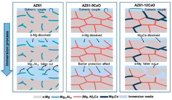 Second, the corrosion resistance can be improved by reducing impurity elements. Elements such as Fe, Ni, and Cu are usually present as intermetallic precipitates, which are harmful because of their low hydrogen overvoltage [86]. The effect of intermetallic compounds on corrosion behavior is complex. The second phase can serve as both a barrier to prevent corrosion of magnesium alloy and as a cathode to accelerate corrosion of magnesium alloy. Hence, the corrosion resistance of Mg alloys is usually related to the type, size and morphology of the intermetallic phase [87,88]. The β phase is expected to be a barrier when there is a small grain size and relatively large β phase fraction, and more importantly, when the β phase is in the form of a continuous network along the Mg grain boundaries. However, microgalvanic corrosion is readily accelerated as the β phase agglomerates and is separately distributed in the Mg matrix with large grain sizes. It is noted that the decreased cathodic and anodic reactions of Mg-Al-Mn-Ca alloy produced by the spinning water atomization process (SWAP) were attributed to the fine dispersion of Al2Ca particles and the supersaturated Al content in the α-Mg matrix, respectively, resulting in superior corrosion resistance [84]. Therefore, the second phase of the dispersed distribution is beneficial to improve the corrosion resistance of the magnesium alloy.