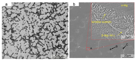 Nevertheless, the elongation of SLMed magnesium alloy is usually low (Figure 9), which may be related to the presence of micropores in the part and the presence and distribution of the second phase. Fractures mostly occur in areas with high porosity. Moreover, for the AZ series magnesium alloy, the research in [28] showed that the existence and distribution of the β-Mg17Al12 phase had a substantial influence on the plasticity. The α-Mg matrix is relatively soft, and its crystal structure is a close-packed hexagonal structure. The brittle and hard β-Mg17Al12 phase has a cubic crystal structure. The β-Mg17Al12 phase in magnesium alloys prepared by SLM usually precipitates along the grain boundaries and is connected to form a network. The crystal structures of the α-Mg and β-Mg17Al12 phases are incompatible, leading to brittleness of the phase interface (α-Mg/β-Mg17Al12); moreover, due to the formation of high dislocation density and stress concentrations at the interface of α-Mg and β-Mg17Al12 [74], cracks nucleated and propagated along the phase interface [75,76,77]. As shown in Figure 10, the second phase precipitated along the grain boundaries, and the cracks were generated at the interface between the two phases.