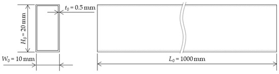 The workpiece used in the experiments and simulations was an aluminum alloy with annealing (A6063-O). Table 1 shows the mechanical properties, and Figure 1 shows the shape and dimensions of the workpiece. The dimensions of the cross-sectional shape were set as follows: height H0 = 20, 10 mm; width W0 = 10, 20 mm; and thickness t0 = 0.5 mm. The waveguide, which is an example of the application range of ultra-thin tubes, has a standard regarding the material, but the rectangular tube with a wall thickness of 0.5 mm applied in this study is not part of this standard. Moreover, it is not marketed because there is a limit to thinning in extrusion. Therefore, in this study, a commercial extruded tube was processed by drawing to achieve a wall thickness of 0.5 mm and applied to the experiment.