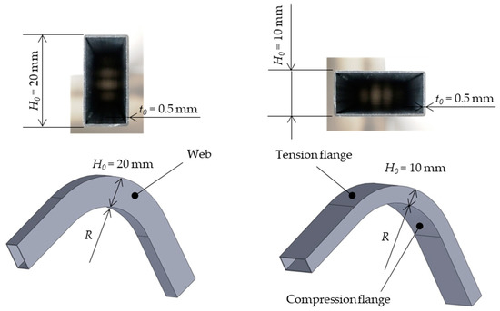 As shown in Figure 2, the bending radius R is the bending drum radius; more precisely, the inside of the rectangular tube is the bending radius. There are two types of rectangular tubes with outer height H0 = 20, 10 mm, and thickness t0 = 0.5 mm (H0/t0 = 40, 20).