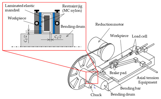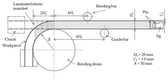 Figure 3 shows a schematic of the rotary draw bending machine, and Figure 4 shows a schematic of the tool alignment of rotary draw bending. This device has a mechanism with a chuck that fixes the material, a bending drum that determines the bending radius, and a bending load rod that generates a bending moment. In addition, it is also equipped with a structure that can apply axial tension. The bending drum can be selected from those with a radius R of 20 to 200 mm, and in this experiment, the workability R/H0 = 1, 2.5. Moreover, a plate made of MC nylon was installed as a side restraint jig.