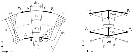 Distributed flattening force wTN on the tension flange is expressed as Equation (6), using Young’s modulus, E, in the elastic state. In the plastic state, the tangent modulus Et is used in Equation (7).
