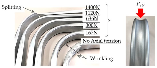 Figure 10 shows the appearance of the workpiece after rotary draw bending without a material, restraint jig, and axial tension. At R/H0 = 1.5 (H0 = 20, R = 50), folding occurred, and at R/H0 = 5.0 (H0 = 10, R = 50), wrinkling occurred. In addition, Figure 11 shows the effect of axial tension. As shown in Figure 11, the wrinkling can be suppressed by axial tension. In contrast, the fall of the flange became large. The axial tension reduced the compression region of the tube, suppressed buckling deformation, and suppressed wrinkling. However, the component force PTN increased as the tensile force increased, causing the tensile flange to fall greatly, resulting in a large expansion of the web. From this result and Equation (6), it was found that the following factors increased influence the cross-section deformation: