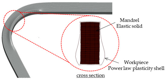 Figure 6 and Table 2 show a schematic of the Finite Element Analysis (FEA) model and the boundary conditions of FEA. LS-DYNA 3D (Ver.R10.1.0, ANSYS Inc. Canonsburg, PA, USA), a commercially available finite explicit element analysis software package, was used for the simulation. The laminated mandrel is a solid element and the rest are shell elements. The mesh size was 2 mm and the number of elements of the workpiece was 17,250. The friction coefficient between the inner surface of the workpiece and the mandrel was set to 0.01 on the assumption that there was almost no friction because the lubricant was applied. In addition, the workpiece was analyzed as an elasto-plastic (Von-Mises) according to the exponentiation hardening rule, the mandrel as an elastic body, and the rest as a rigid body. The workpiece in the model was assumed to be an isotropic elastoplastic body with the power law hardening rule. The constitutive equation is given as Equation (1).