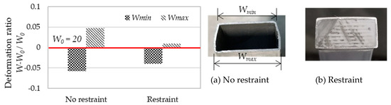 Based on the results obtained so far, Figure 18 shows a comparison of the cross-sectional shapes acquired by unconstrained and constrained bending. As shown in Figure 18, the maximum width Wmax was significantly improved by applying the constraint. In addition, the height H was reduced by 4.4%, and the minimum width Wmin was reduced by 9.8%. A decrease in height H is considered to be due to the clearance between the tube and the mandrel, and the decrease in minimum width Wmin is considered to be due to the axial tension.
