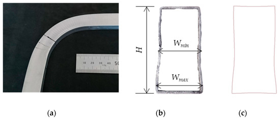 However, these studies are mainly the results of investigations of circular pipes and materials with a wall thickness of 1.0 mm or more [24,25]. In contrast, there has been little research on clarifying and suppressing the cross-sectional deformation phenomenon during bending of a rectangular tube with a rectangular cross-section and ultra-thin materials with a wall thickness of 1.0 mm or less. If ultra-thin tubes can be applied to various components in the automobile and aerospace industries, it is expected that they will contribute significantly to the reduction of size and weight, which is a common issue in each industry in recent years. Among them, the rectangular tube is considered for application in the waveguide, which is a component for electromagnetic wave propagation in the aerospace industry. However, in order to improve the electromagnetic wave propagation efficiency, it is necessary to minimize the cross-sectional deformation after bending. We investigated the effect of a mandrel and a restraint plate on undesirable distortions in the cross section of an extruded square tube on press bending [26]. Furthermore, we also reported that wrinkling in rotary draw bending can be suppressed by axial tension, and that cracking is considerably affected by the bending radius and material. In addition, it has been clarified that pear-shaped cross-section deformation occurs when a mandrel is applied during the bending of ultra-thin tubes [27,28].