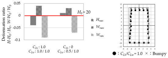 Figure 15 shows the experimental results for R/H0 = 2.0 (H0 = 10, R = 20). It was found that the convex distortion of the web was suppressed to less than 5% by applying the restraint jig. In addition, at the minimum part (tensile flange), the width W decreased due to axial tension applied to suppress wrinkling. Therefore, it was found that the accuracy of the width tends to deteriorate slightly compared to the maximum part (compression flange).