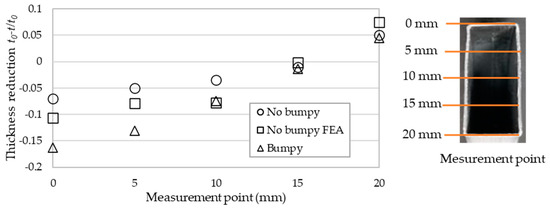 Therefore, bending was performed by applying a stepped laminated mandrel, as shown in Figure 20. Table 3 shows the experimental conditions. The height of the rectangular tube was H0 = 20 and the bending radius was R = 50. Axial tension was applied, and the height of the restraint jig was set to h = 20. The clearance between the rectangular tube and the core material was ChL = 0 to 0.5 in the height direction and 0.5 mm in the width direction. Moreover, the effect was confirmed by adding a step of 1.0 mm on the compression side and 0.5 mm on the tension side with the center line as the boundary. Figure 21 shows the appearance after bending under each condition. Wrinkling occurred in Figure 21a. This is considered to be because the clearance in the height direction was as large as 0.5 mm and the depression of the compression side flange surface, PTN, could not be suppressed. In addition, in Figure 21b, splitting occurred. In contrast, in Figure 21c, a cross-sectional shape without wrinkling or splitting was obtained. In order to examine these results, the post-bending cross-sections were compared under the condition that the clearance was 1.0 mm in both height and width, and the condition where the bumpy mandrel was applied. Figure 22 shows a comparison of deformation ratio and Figure 23 shows a comparison of changes in wall thickness. Figure 20 demonstrates Hmax was significantly suppressed in the bumpy mandrel. It is considered that this is because the bending in the case of using the bumpy mandrel was CLh = 0 mm; thus, the deformation in the height direction could be suppressed more than CLh = 1.0 mm. Accordingly, it was found that the clearance in the height direction needs to be as small as possible to suppress the deformation in the height direction. In contrast, the deformation of the width W was suppressed to some extent, but its effect was smaller than that of H. As shown in Figure 21b, if the clearance on the tension side in the width direction is set small (0.5 mm), a decrease in the width direction is suppressed, but conversely, cracking occurs. It is considered that this is because the tension of the mandrel was increased and the friction between the mandrel and the tube was increased by decreasing the clearance. Therefore, it was found that it is necessary to adjust the clearance in the width direction of the mandrel on the tension side to allow the tension and friction to relief in order to obtain a highly accurate cross-section after bending in thin-walled tubes.