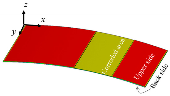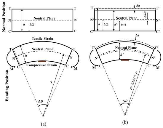If the thickness of the test piece is decreased due to corrosion, the distance between the neutral plane and the surface under the corroded area is decreased, as shown in Figure 1b. From (1), assuming that ρ >> h, the change in strain can be expressed as