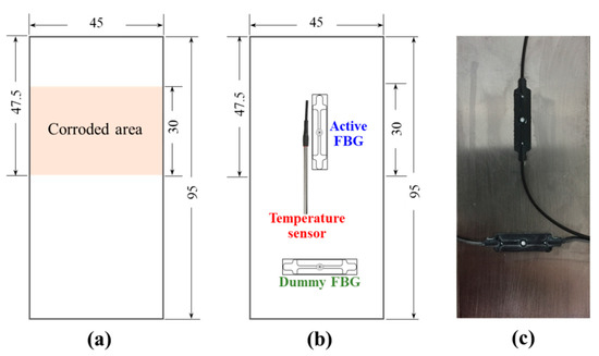 Figure 3 shows the configuration of the FBG sensors on the test piece. Sensors were placed on the reverse of the corroded area of the test piece (Figure 3a) in the configuration shown in Figure 3b. The active FBG sensor was placed parallel to the longitudinal axis, while the dummy FBG sensor was placed parallel to the transverse direction of the test piece in the compressed curve apparatus. An actual figure of the FBG sensors in the test piece is shown in Figure 3c.