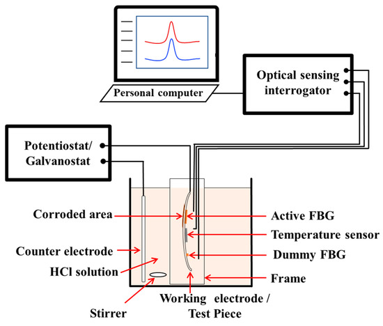 We conducted galvanostatic electrolysis experiments to verify the accuracy of our technique in identifying corrosion rates. An illustration of the set-up used in these experiments is shown in Figure 4. We used a 1 mol/L hydrochloric acid solution for accelerated simulation of the effects of environmental corrosion, and a stirrer to ensure a homogeneous liquid mixture. To reduce its thickness, a current of 0.3 A was applied to the test piece, which acted as the working electrode, through the potentiostat/galvanostat. The strain on the test piece was measured using an optical sensing interrogator and personal computer setup sampling at an interval of 30 s. The thickness of the test piece was measured before and after the experiment to verify the change in thickness (Δh) estimated from the strain measurement. Finally, the working electrode and counter electrode were constructed from the same material.