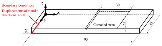 To isolate components of strain resulting from reduced test piece thickness due to corrosion from components resulting from deviations to the experimental environment, accurate configuration of the positions of the active and dummy FBG sensors is necessary. To determine these positions, we analyzed the behavior of the low-carbon steel test pieces subject to various sources of strain with FEM, using a commercial software (ANSYS Mechanical APDL 18.2 from ANSYS Inc., (Canonsburg, PA, USA). Figure 5 shows the analytical geometry and boundary conditions applied to the test piece before applying ρ of 430 mm to the test piece. The z displacement along the y-axis at the x = 0 node of the test piece was fixed to 0 before/after applying ρ of 430 mm to the test piece. After applying ρ of 430 mm to the test piece, the z coordinates of the test piece at each x coordinates were determined according to the equation below: