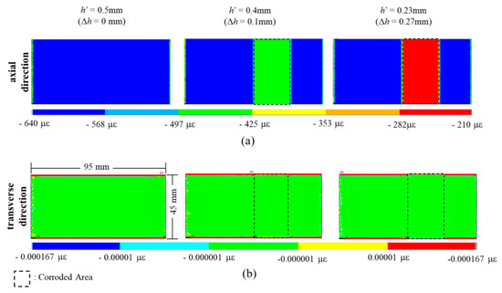 The geometry of the experimental apparatus indicates that the back side of the test piece experiences a compressive strain, while the surface of the piece experiences a tensile strain (Figure 1). Figure 6 shows the analytical result with a thickness reduction of 0.2 mm. Red and yellow colors mean 581 με and 350 με in axial direction. The dimension is 95 mm in length and 45 mm in width and the corroded area is 1350 mm2 (30 mm × 45 mm). Figure 7 shows the side view of the xy plane of simulated strain distribution on the back side of the test piece with and without a reduction to the thickness of the corroded area, with Figure 7a depicting the distribution in the axial direction, and Figure 7b depicting the distribution in the transverse direction. Without a reduction in thickness (h = 0.5 mm), a uniform strain (as indicated by the homogenous blue shading) of −579 µε was calculated in the axial direction from an average of five points, a value which is similar to the one predicted by analytical methods (−581 µε). In contrast, in the transverse direction, the strain was 0 µε, indicating that the moment applied a longitudinal strain in the x direction of the test piece. Similarly, for the corroded area of the test piece, when h = 0.1 mm and h = 0.27 mm, the magnitude of the strain in the axial direction predicted using numerical and analytical models was the same. Based on these FEM simulations, a decrease in the thickness of the corroded area of the test piece does not affect the strain distribution in the transverse direction.