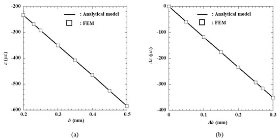 (a) Relationship between the strain (ε) and thickness of the test piece (h) from FEM simulations. (b) Relationship between the change in strain (∆ε) and change in thickness Δh in mm from FEM simulations. The analytical model provides the line of best fit in both plots.