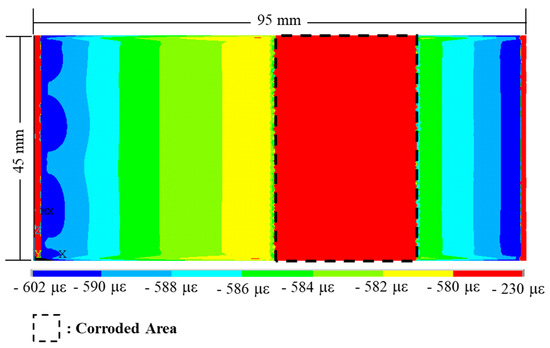 Analytical result with a thickness reduction of 0.2 mm. Red and yellow colors mean 581 με and 350 με in axial direction. The dimension is 95 mm in length and 45 mm in width and the corroded area is 1350 mm2 (30 mm × 45 mm).