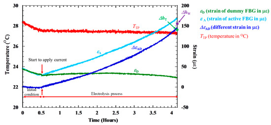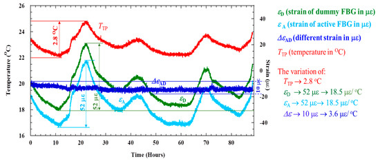 Figure 10 shows the results of the thermal strain measured by the FBG sensors of the ACSSM in the preliminary experiments. In this figure, TTP is the temperature of the test piece in degrees centigrade, εA is the strain from the active FBG sensor in με, εΔ is the strain from the dummy FBG sensor in με, and ΔεAD is the difference in strain between εA and εD. Both sensors had similar responses to temperature variations, producing a maximum change in strain of approximately 52 με for a 2.8 °C temperature variation, in the absence of changes to the thickness of the test piece. In contrast, for the same variation in temperature, the maximum change in the value of ΔεAD was ~10 με. This reduced sensitivity to temperature makes this signal more suitable for strain measurement to determine the atmospheric corrosion rate, which requires high resolution and long-term data monitoring in the field.