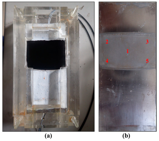 (a) Test piece in the experimental apparatus following electrolysis. (b) Location of points measured for evaluation of change in thickness after electrolysis.