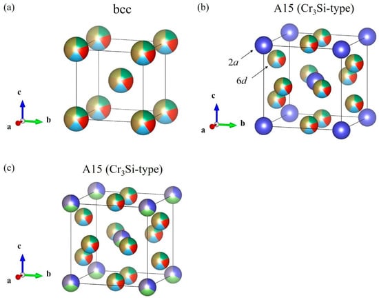 where n is the number of components, ci is the atomic fraction and R is the gas constant. According to this equation, we classify low-entropy alloys as having an R less than 0.69, medium-entropy alloys (MEAs) have an R between 0.69 and 1.60 and HEAs have an R of 1.60 or larger []. In this review, we basically follow the first definition for the single-site (fcc, bcc, and hcp) HEAs. The concept of HEA has now been adopted in many multisite alloys beyond bcc, fcc and hcp structures. In such a case, a multicomponent form is realized in the specific or respective crystallographic site in the material, hereafter called multisite HEA. A quantitative definition of multisite HEA does not exist; thus, we regard a reported compound as a multisite HEA if the word “HEA” is used for the compound in the paper. Figure 1a draws the crystal structure of a single-site (bcc) HEA. In the bcc structure (space group: Imm, No. 229), only the 2a site is present, which is randomly occupied by several atoms. Figure 1b,c show the examples of multisite HEAs with the A15 phase (space group: Pmn, No. 223), possessing sites 2a and 6d. In Figure 1b, the 6d site is randomly occupied by several different atoms, while the specific atom occupies the 2a site. On the other hand, both Wyckoff positions show an atomic disorder in Figure 1c.
