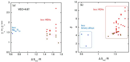 ΔSmix/R dependence of (a) Tcobs /Tcbase and (b) δ for bcc high-entropy alloy (HEA) and binary alloy superconductors. The δ-values of bcc binary alloys are 1.47 for Nb66Ti33, 4.15 for Ta50V50, and 4.33 for Ti20V80.