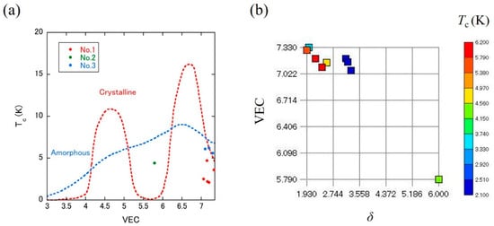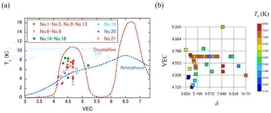 Figure 5a displays the VEC dependence of Tc for hcp and hcp-related HEA superconductors. The curves of crystalline and amorphous superconductors are also shown. Almost all HEAs show an enhancement of Tc as the VEC is decreased to 7. In some alloy systems, samples with a VEC lower than 7 contain a secondary phase. Thus, an optimal VEC may be near 7.0. However, Tc values tend to be lower than those of both crystalline and amorphous superconductors. Tc is plotted as a function of δ and VEC in Figure 5b. As in the case of bcc HEA superconductors, Tc is rather insensitive to δ for each system; however, the hcp HEAs seem to have little tolerance of δ compared to bcc HEAs. This may be an important factor for designing hcp HEAs. The relationship between VEC and the phase stability of fcc and bcc HEAs has been well established []: a single bcc phase for a VEC between 5.0 and 6.87 and a single fcc phase for a VEC larger than 8.0. On the other hand, the correlation of VEC and the hcp phase stability is not well understood, meaning that a wide range of VEC examination might be necessary for materials research. At present, almost all compounds concentrate on a narrow VEC range between 7.0 and 7.33, which is also contrasted with the wide distribution of VECs in the bcc HEA superconductors.