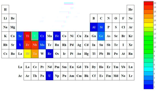 When we design a bcc HEA superconductor, the elemental makeup is an important factor to be considered []. To elucidate the trend of the elemental makeup, the frequency with which elements are used in the bcc HEA superconductors reported to date (Nos. 1–20 in Table 1) is shown in Figure 4 on the periodic table. The elemental makeup mainly consists of Hf, Zr, Ti, Ta, Nb, and V with a VEC of 4 or 5, due to the VEC requirement of the Matthias rule; that is, Tc shows a broad peak at approximately a VEC of 4.5. A bcc HEA superconductor with a VEC larger than 4.8 is rarely found (see Figure 3a), and to our knowledge, a bcc HEA superconductor with a VEC between 6 and 8 has not been reported. A VEC larger than 4.8 can be attained by using mainly Cr, Mo and/or W with the combination of 4d or 5d late-transition metals. In particular, a W-containing bcc HEA superconductor is still missing and would be a valuable topic of research. It should be noted here that, according to the well-known relation between VEC and the phase stability for fcc and bcc solid solutions in HEAs, a single bcc phase HEA would not be obtained at a VEC larger than 6.87 [].