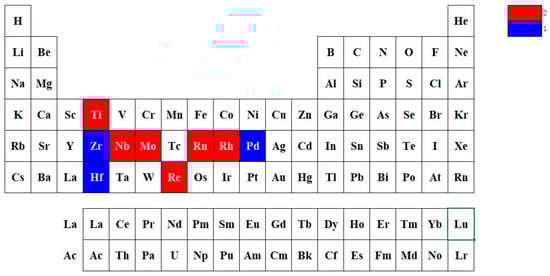 The elemental makeup of hcp and hcp-related HEA superconductors is shown in Figure 6, although the number of substances is small. In contrast to the bcc HEA superconductors, the constituent elements are equally distributed among Ti, Nb, Mo, Re, Ru and Rh with different VECs. The hcp elements of Re and Ru, in particular, might play an important role in the stabilization of the hcp structure. As can be seen from Figure 4, a group 13 or 14 element can be added into the bcc HEA superconductor. In hcp HEA superconductors, the study of the addition of these kinds of elements is also needed.