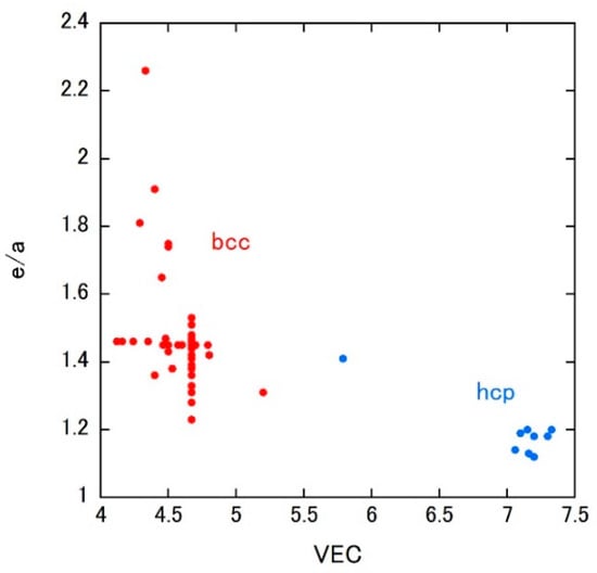 Here, we focus on both e/a and VEC to further elucidate the material design of bcc and hcp HEA superconductors. The value of e/a is the average number of itinerant electrons per atom and was originally proposed for the Hume–Rothery electron concentration rule. This concept is connected to the interaction of the Fermi surface with the Brillouin zone; thus, the e/a value is a good criterion for the stabilization of a crystal structure type []. On the other hand, VEC reflects the total density of states of the valence band integrated from the bottom up to a given energy. Therefore, VEC is a good scale of Tc, depending on the density of states at the Fermi level. The e/a-values of HEA superconductors are calculated as listed in Table 1 and Table 3 using the updated e/a-value for each element []. Then, the phase selection diagram of bcc and hcp HEA superconductors based on VEC and e/a is constructed as shown in Figure 7. While e/a values of bcc HEA superconductors are widely distributed, those of hcp superconductors might be in a narrow range, which means that the e/a of hcp HEA is useful for the judgment of phase stability. At the present stage, the phase selection diagram may work well, although VEC can solely distinguish between bcc and hcp HEA superconductors. The simultaneous consideration of e/a and VEC would assist in reliable material design.