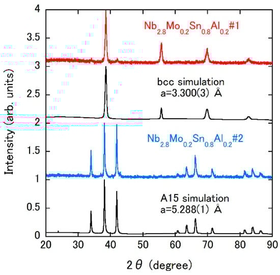 X-ray diffraction (XRD) patterns (Cu-Kα) of Nb2.8Mo0.2Sn0.8Al0.2 #1 and #2. The simulation patterns of bcc and A15 phases are also shown. Each pattern is shifted by an integer value for the clarity. The lattice parameters were determined with the help of the Rietveld refinement program [,].