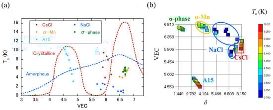 Although the VEC values of some compounds might be meaningless, in Figure 9a, we have constructed the same plot as that of the bcc or hcp HEAs, except for compound No. 6 in Table 4, which does not contain the information concerning the VEC dependence of Tc. The A15 HEAs follow the Matthias rule. The CsCl-type and the NaCl-type HEAs show a deviation from the Matthias rule of crystalline 4d metal solid solutions; however, in each system, a correlation between Tc and VEC is observed, as Tc tends to be enhanced as VEC decreases. While Tc also seems to depend on VEC in the α-Mn-type or the σ-phase HEAs, the Tc values are smaller than those of crystalline 4d metal solid solutions and amorphous 4d metals. The existence of a dependence of VEC on Tc suggests the important role of the density of states for determining Tc. However, a universal dependence cannot be confirmed, because the shape of the density of states is uniquely governed by the crystal structure and/or the picture of a rigid band model may be broken in some cases.