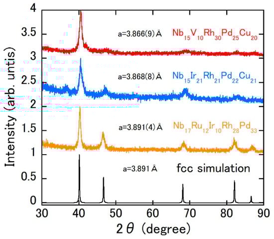 XRD patterns (Cu-Kα) of Nb15V10Rh30Pd25Cu20, Nb15Ir21Rh21Pd22Cu21 and Nb17Ru12Ir10Rh28Pd33. The simulation pattern of the face-centered-cubic (fcc) phase with a = 3.891 Å is also shown. Each pattern is shifted by an integer value for clarity. The lattice parameters were determined with the help of the Rietveld refinement program [,].