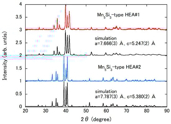XRD patterns (Cu-Kα) of Mn5Si3-type HEAs. The simulation patterns are also shown. Each pattern is shifted by an integer value for clarity. The lattice parameters were determined with the help of the Rietveld refinement program [,].