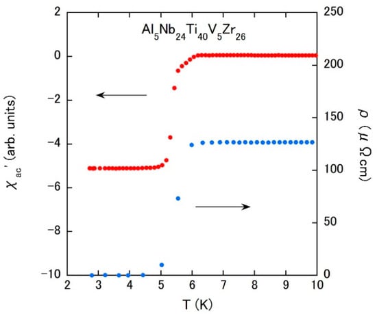 A specific class of β-titanium alloys after cold rolling shows unusual mechanical behaviors such as superelasticity and a low modulus; these are called gum metals, which are in practical use in wire frames for glasses, medical equipment and so on []. This material is attracting research attention worldwide in the field of titanium alloys. Gum metals are characterized by three specific values: a VEC of 4.24, a bond-order of 2.87 based on the DV-Xα method and a d-electron orbital energy level of 2.45 eV. The VEC value is appropriate for the appearance of the superconductivity of d-electron alloy superconductors. Besides this, the compositions of gum metals have some implied similarities with HEAs. Figure 12 shows the preliminary results of the temperature dependences of the ac magnetic susceptibility χac (T) and electrical resistivity ρ (T) of as-cast Al5Nb24Ti40V5Zr26, which was recently reported to be a gum metal-like HEA alloy []. The diamagnetic signal of χac and the zero resistivity below approximately 5 K indicate superconductivity. Gum metals are highly advantageous for making wires; thus, if good superconducting properties are preserved even after cold rolling, this kind of material would be a good candidate for next-generation superconducting wire.