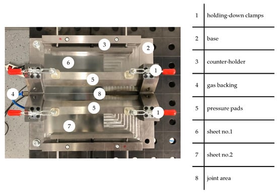To provide for a repeatable welding result of thin sheet material in butt joint configuration, the selected sheets had to be securely fastened using a custom clamping device, whose setup can be seen in Figure 1.