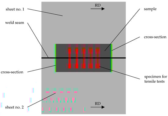 Schematic illustration of sample extraction, and locations of cross-sections and specimens for tensile testing with rolling direction (RD) of the sheet material.